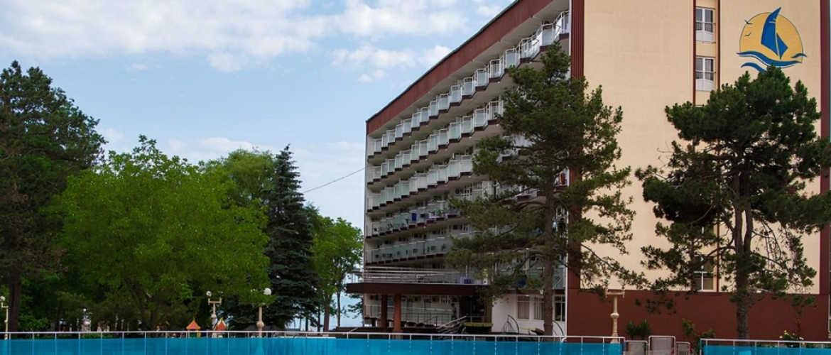 Семиэтажный корпус с лифтом и 178 номерами, каждый с балконом. У входа гостей встречает стилизованный металлический парус, а вокруг — пальмы и уютные лавочки. На первом этаже — детская комната, а рядом — игровая площадка.